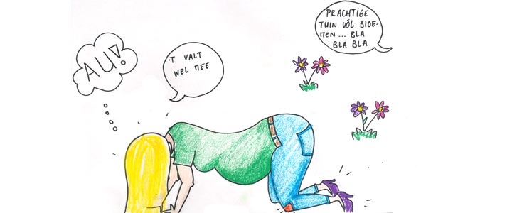 “Gaat ’t echt wel joh?” vraagt ze terwijl ze haar lach probeert in te houden.