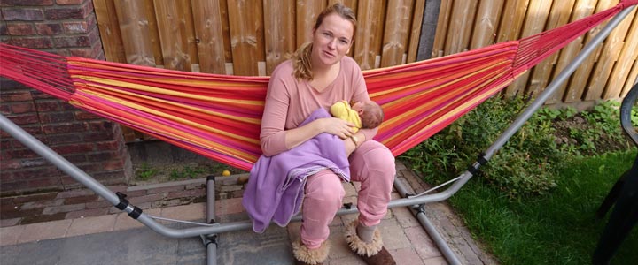 Persweeën Ik hing over de zachte rand van het opblaasbad en ik begon druk te voelen, dus ik riep heel klassiek “Ik moet poepen”, waarop ze zeiden “Nee hoor, dat is gewoon het hoofd van je meisje ...