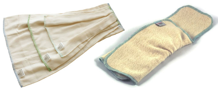 Hier overheen komt een apart waterdicht overbroekje. Let op dat de luier geheel binnen het overbroekje valt, tegen lekkage. Een andere manier is de buitenste banen naar binnen vouwen, zodat je een lange absorberende strook krijgt, die je in het overbroekje stopt. Vouwluiers drogen gemakkelijker dan alles-in-één luiers en voorgevormde luiers.